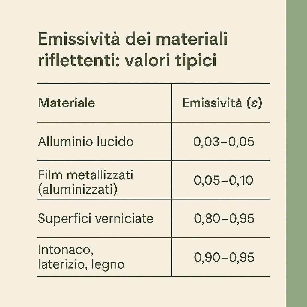 - ε ≈ 0,03–0,10 → superfici riflettenti (alluminio, film metallizzati)