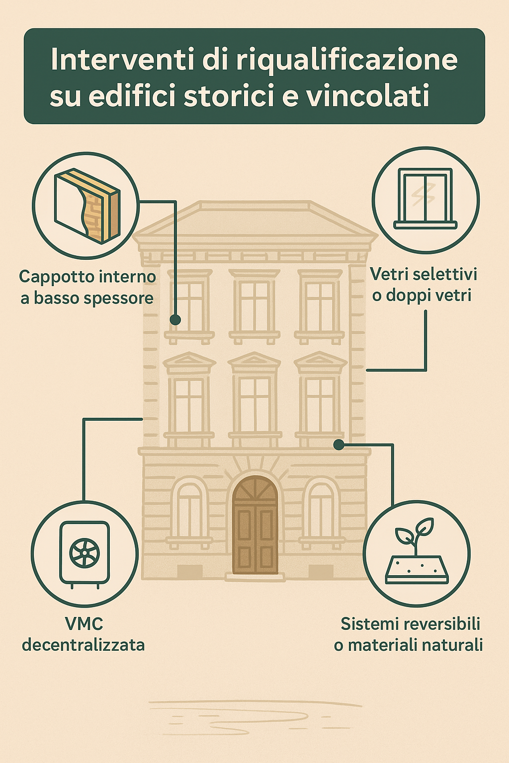 - Stratigrafie murarie complesse, materiali originari, tecniche costruttive che non si prestano facilmente a isolamenti standard.
